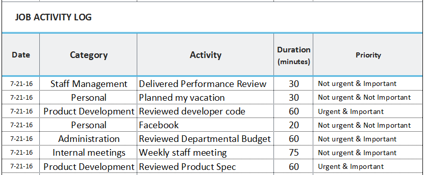 - Regardless of the reason for asking an employee to complete the Job Activity Log over a period of time, provide them with an opportunity to do a trial run first so they can understand what they're spending their time on before having to disclose the data. This is often a huge eye-opener that may instantly improve productivity. As mentioned, most of us don't have a clue about what we spend our time on, and how much time is spent on activities that don't add any value.
